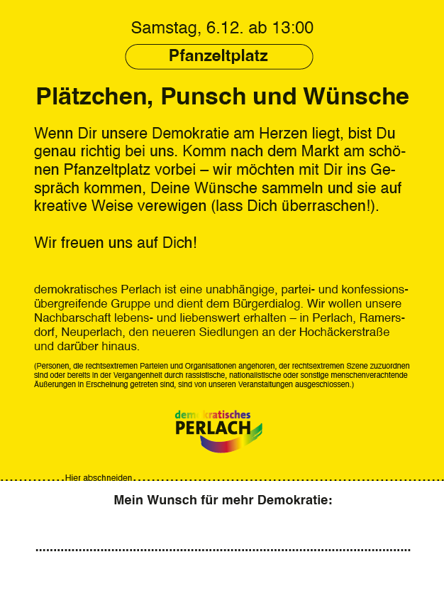 demokratisches Perlach ist eine unabhängige, partei- und konfessions-übergreifende Gruppe und dient dem Bürgerdialog. Wir wollen unsere Nachbarschaft lebens- und liebenswert erhalten – in Perlach, Ramersdorf, Neuperlach, den neueren Siedlungen an der Hochäckerstraße und darüber hinaus.