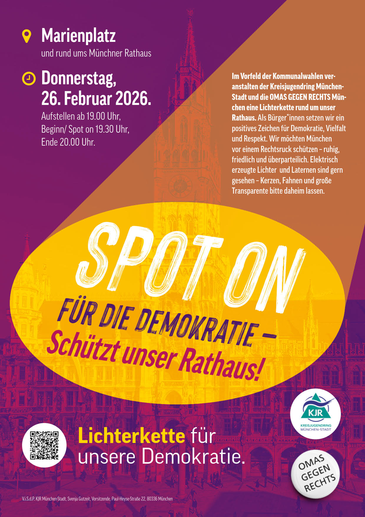 Vor den Kommunalwahlen veranstalten die OMAS GEGEN RECHTS München und der Kreisjugendring München-Stadt eine Lichterkette rund um unser Rathaus. Als Bürger*innen setzen wir ein positives Zeichen für Demokratie, Vielfalt und Respekt. Wir möchten München vor einem Rechtsruck schützen – ruhig, friedlich und überparteilich. Bitte nur elektrisch erzeugte Lichter und Laternen. Kerzen, Fahnen und große Transparente […]